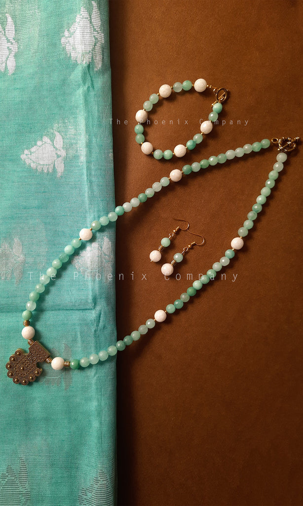 This Handmade Pastel Green & White Beaded Jewellery Set is a statement piece that is subtle and elegant. Handmade with love, this set with pastel green and white beads and a golden colour pendant is a perfect match for sarees including our Teal Green with silver threadwork Jute silk Saree. This set comes with matching earrings and bracelet/anklet too.